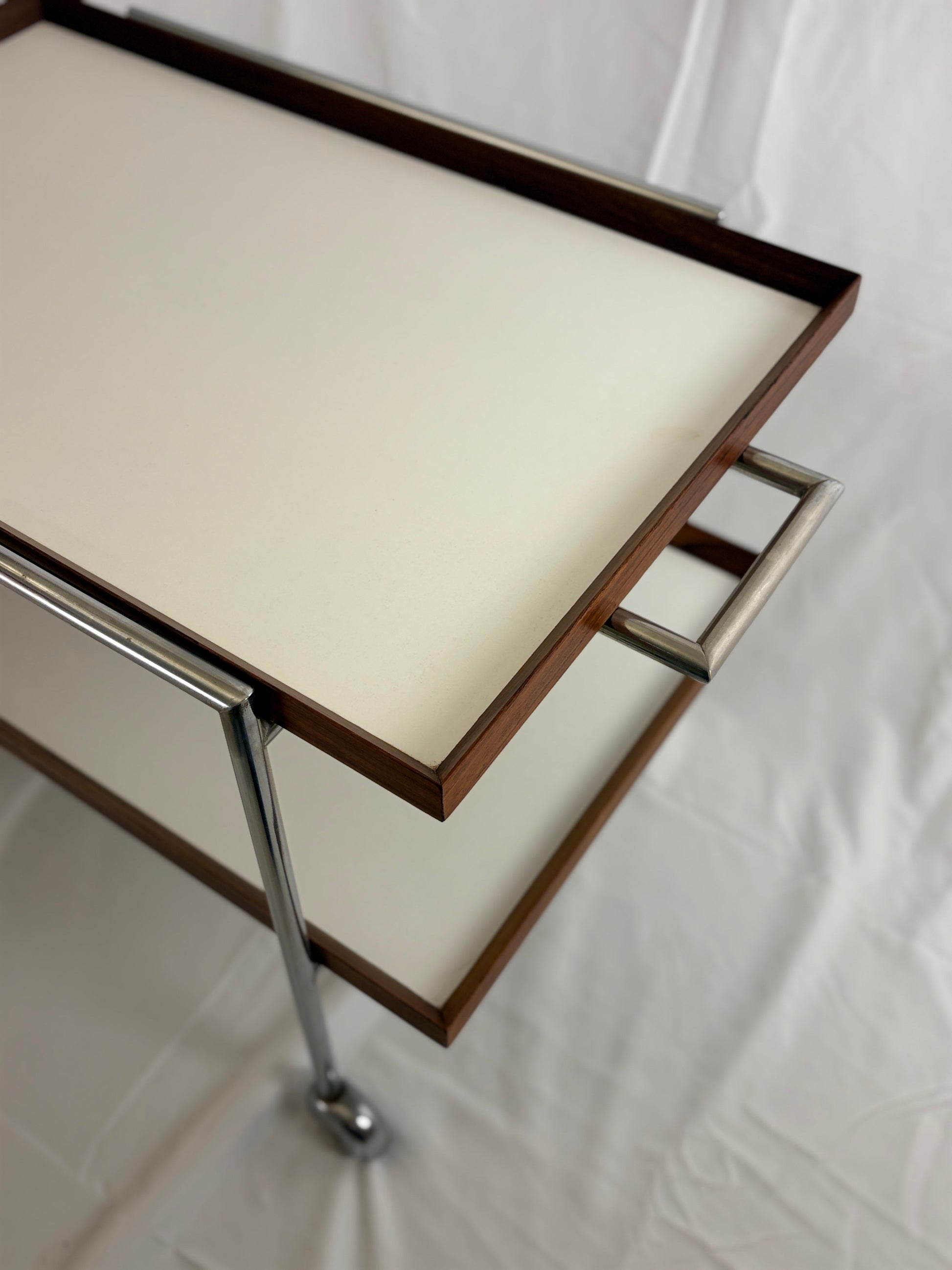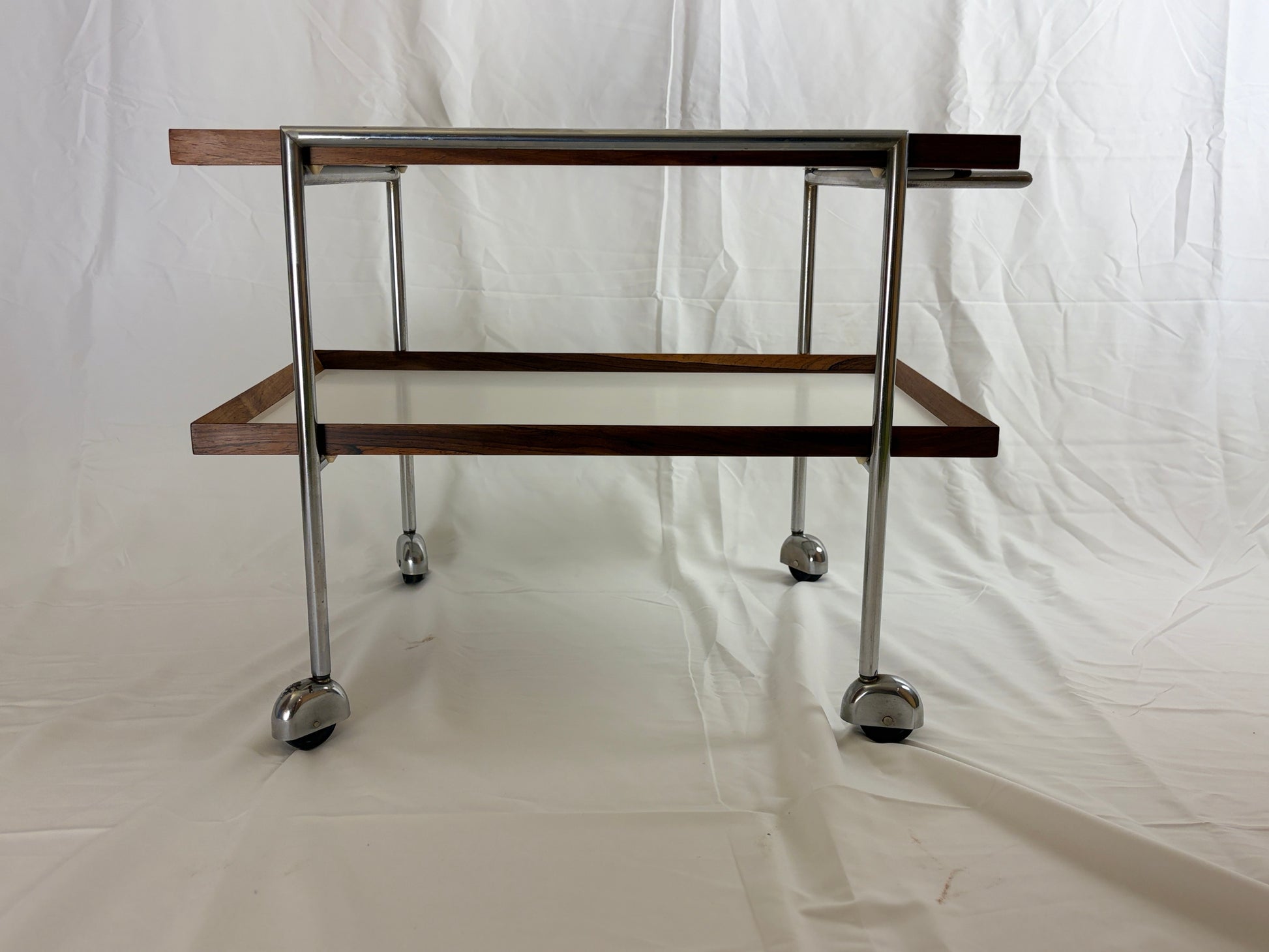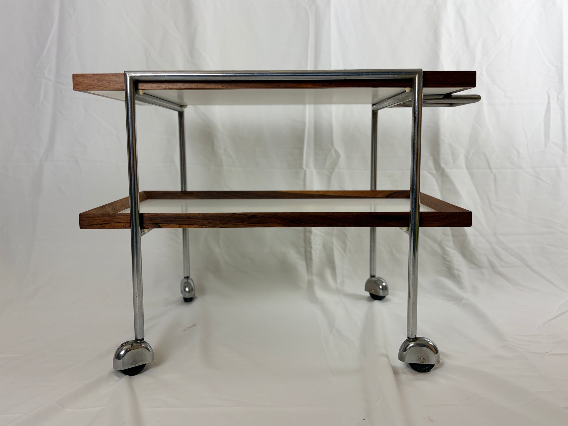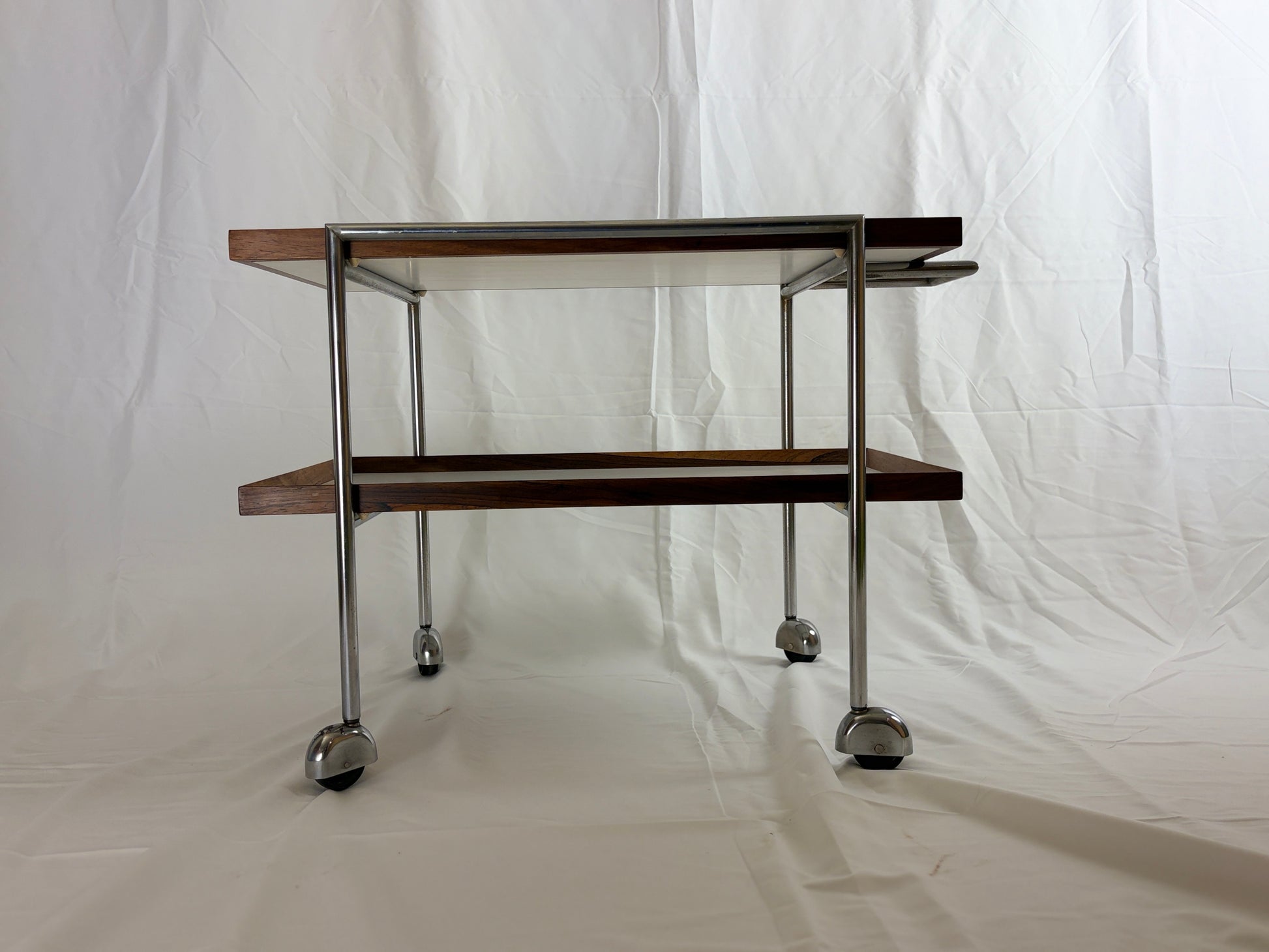 This elegant serving trolley embodies iconic 1960s design. Designed by Poul Norreklit and manufactured by E. Pedersen & Son in Denmark, the piece impresses with its harmonious blend of functionality and aesthetics. The white laminated trays rest on a rosewood base with a chrome-plated steel frame – a classic combination of materials that exudes timeless elegance. With its casters, the trolley offers practical mobility for any room. The removable trays allow for flexible use. Dimensions: approx. 50 cm high, 71.5 cm long, 44 cm wide. An authentic vintage design piece for discerning collectors.