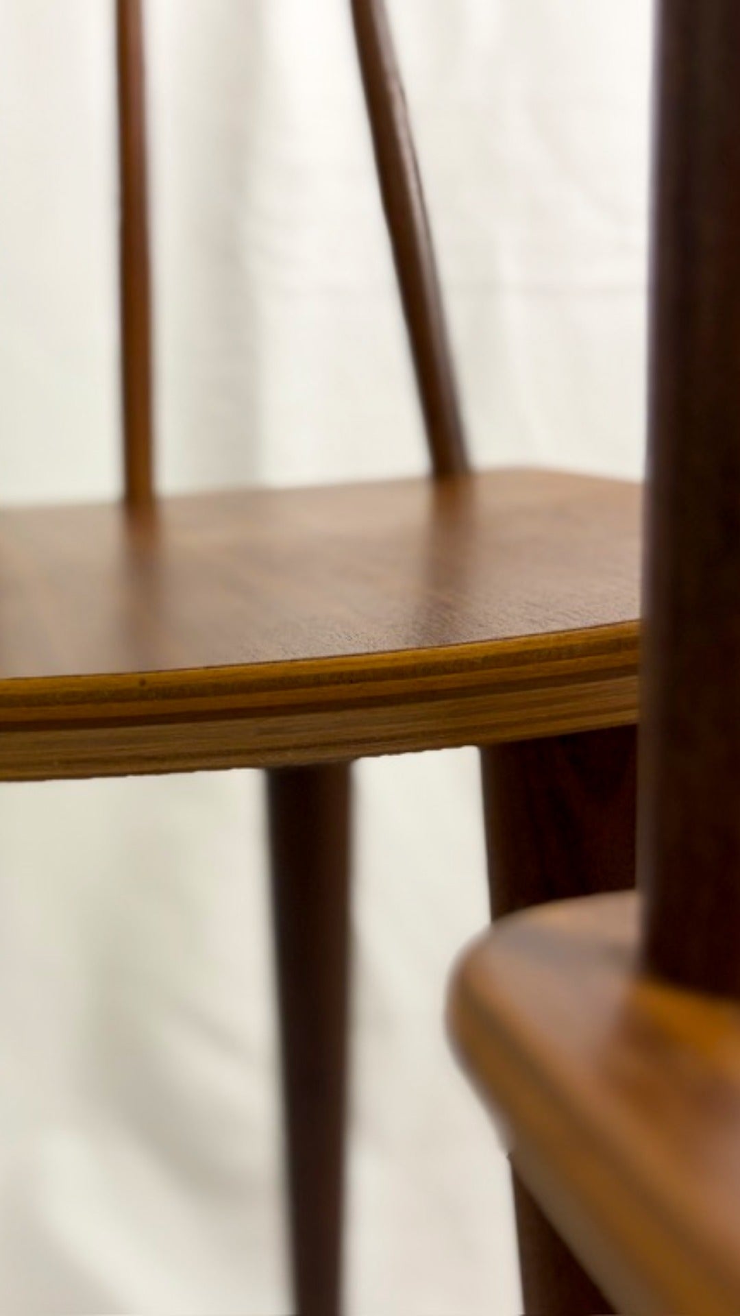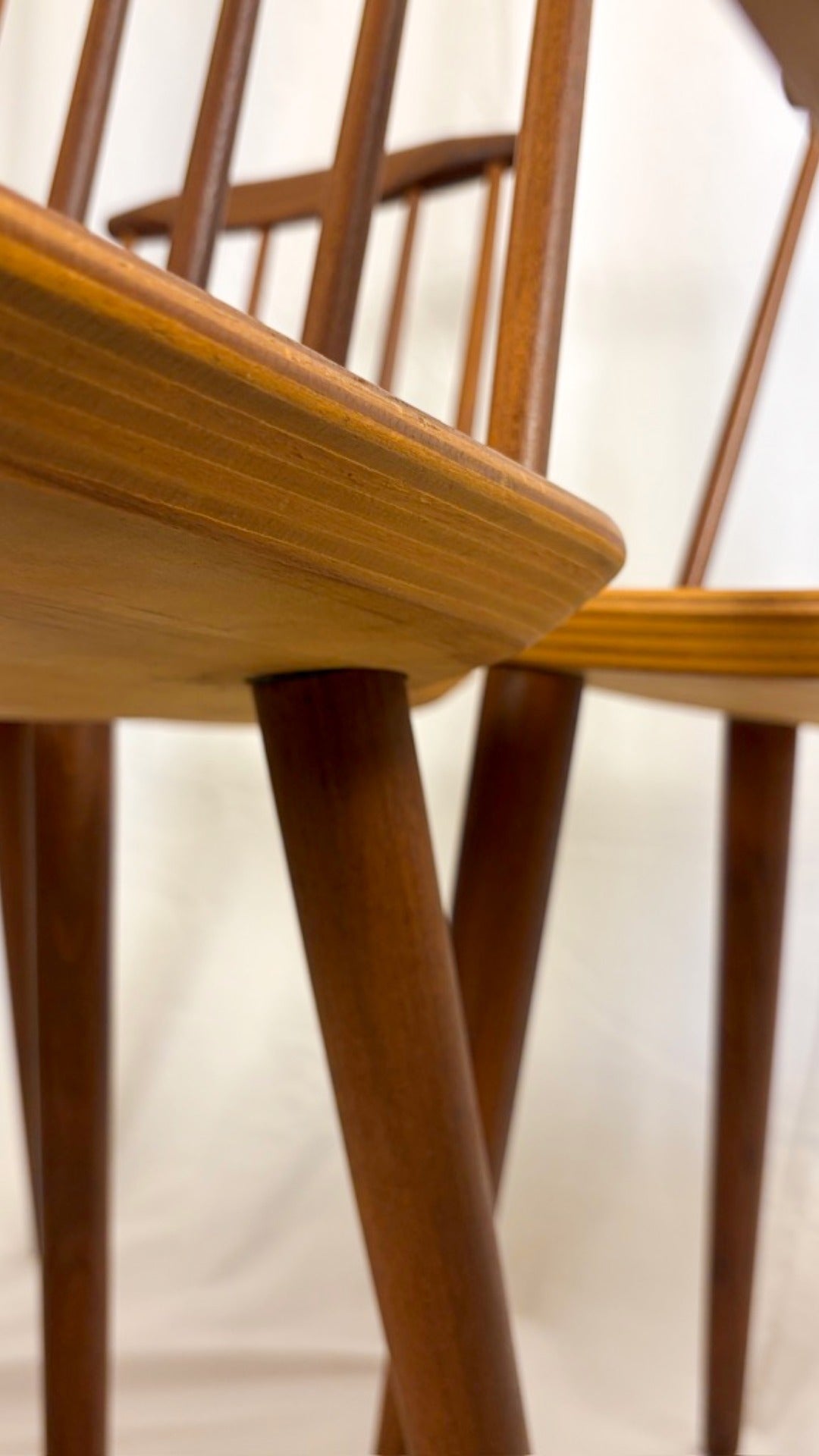 A quartet of iconic mid-20th-century design chairs: the J77 models by Folke Poulsson, produced in 1960 by the renowned FDB furniture factory. Crafted from solid teak, these Danish masterpieces combine the tradition of the Windsor chair with minimalist Nordic aesthetics. Each chair offers a seat height of 44 cm and compact dimensions of 45 x 40 cm – ideal for flexible room layouts. Originating in Scandinavia and preserved in superb vintage condition, these chairs represent timeless craftsmanship and functional design.