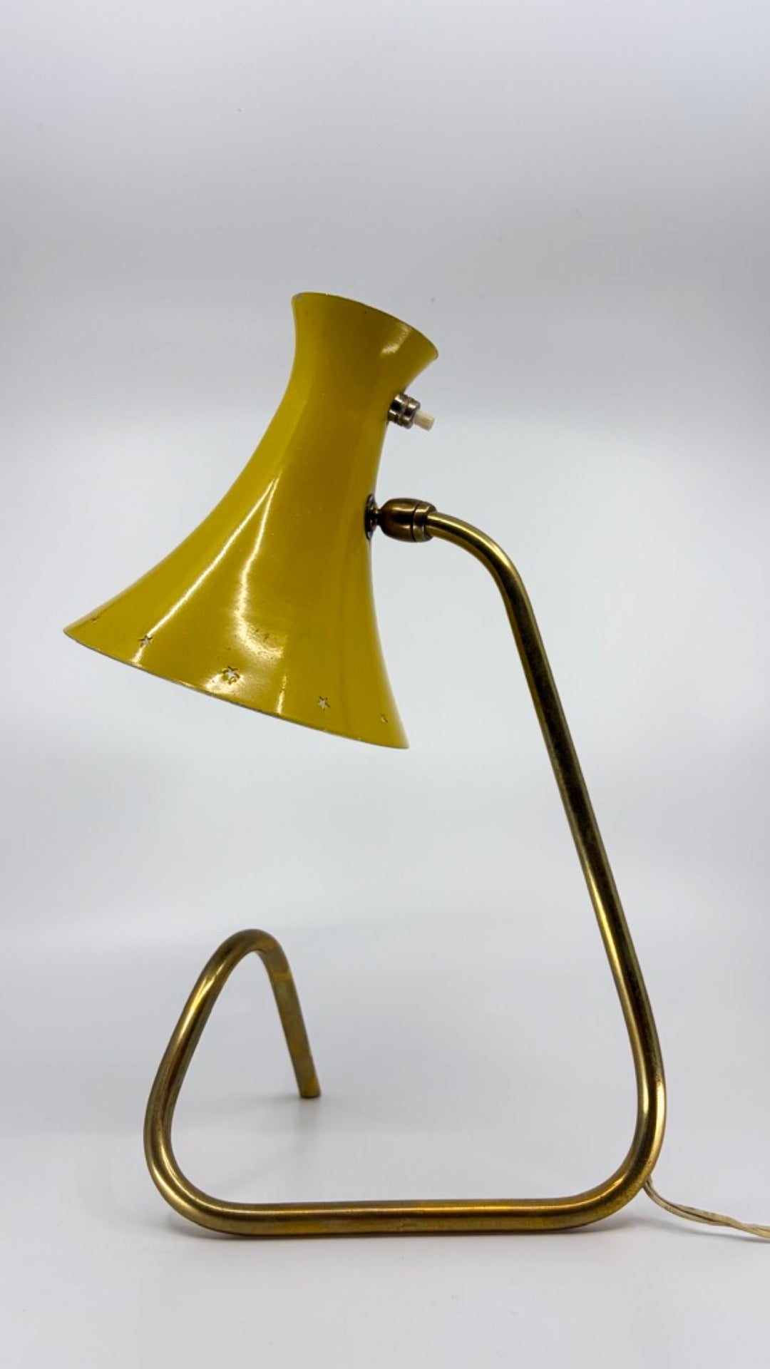 - Special feature: yellow lacquered sheet metal and patinated brass, joints, rare desk or floor lamp with a geometric design