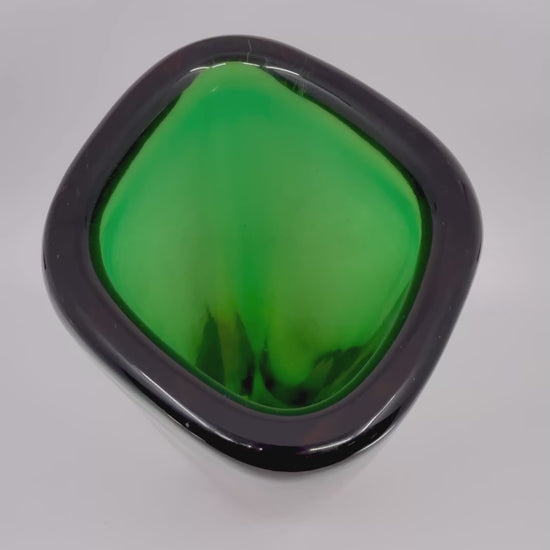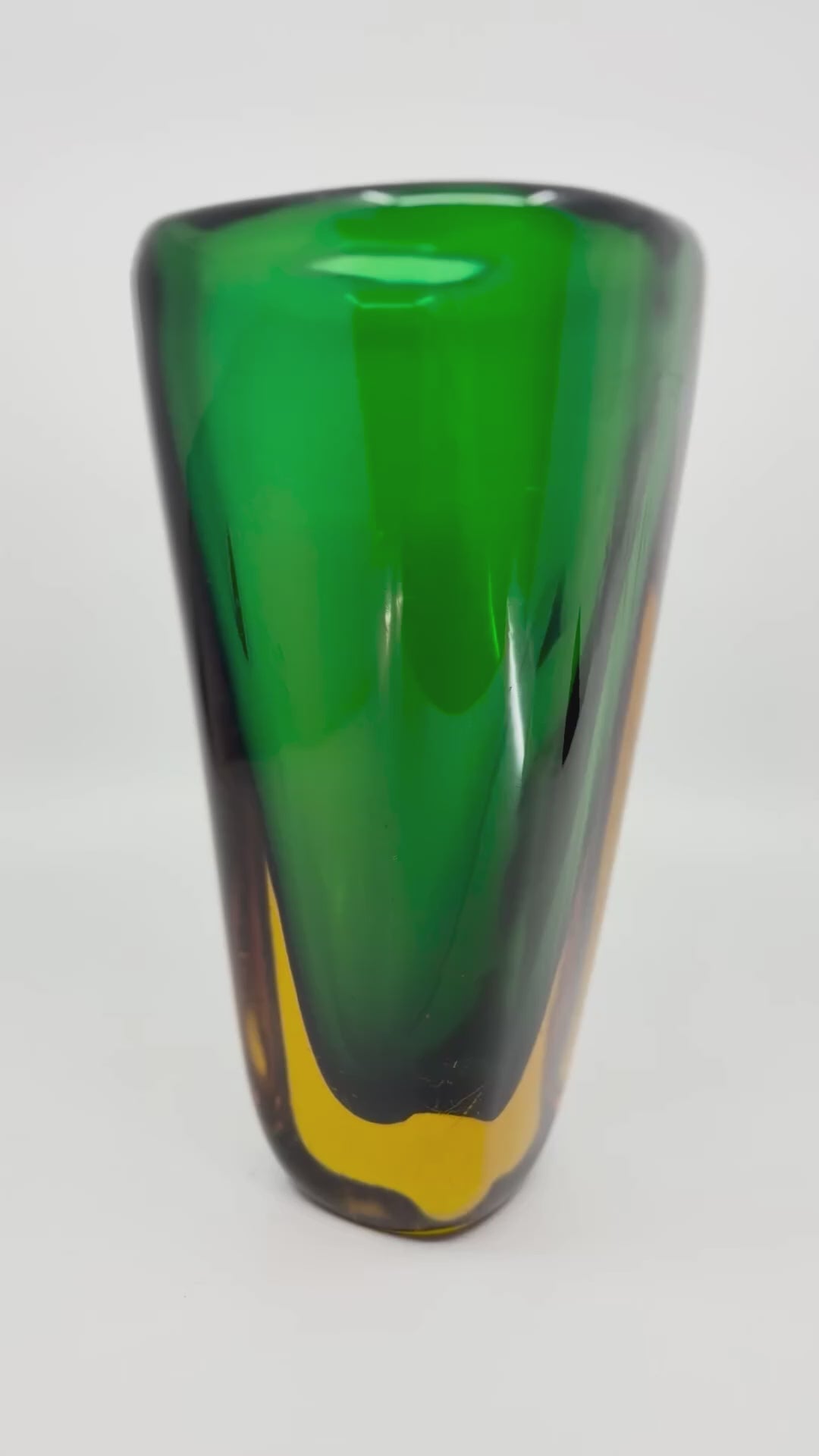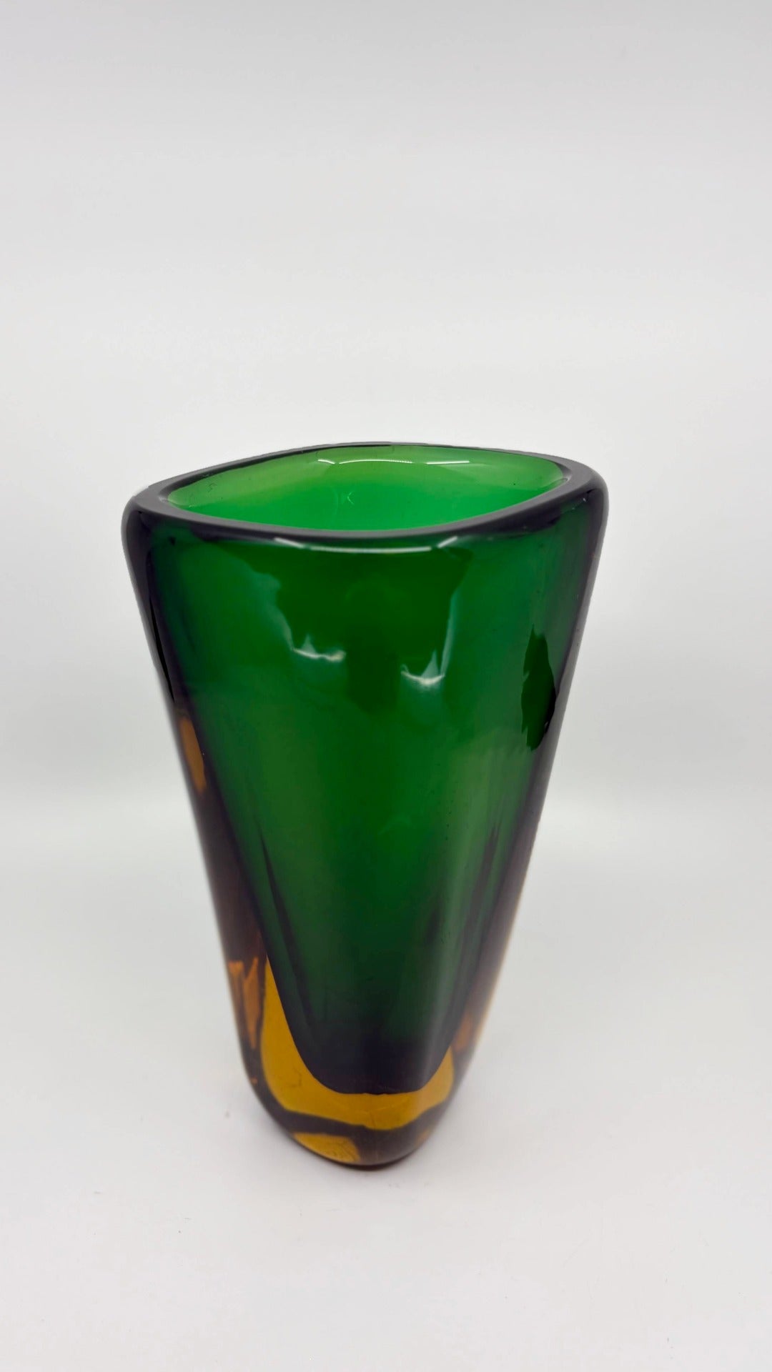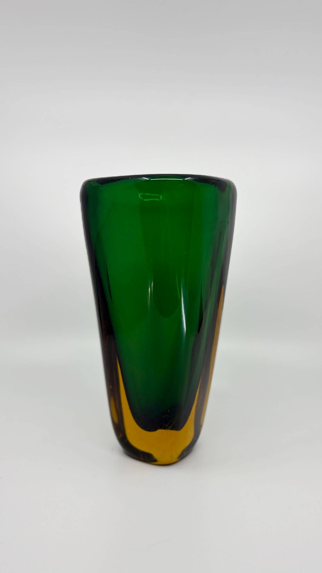 Chef-d'œuvre de l'art verrier de Murano des années 1950, cet élégant vase Sommerso d'Archimede Seguso séduit par sa technique caractéristique : un verre clair à parois épaisses, rehaussé d'un riche liseré vert et d'inclusions de verre ambré, harmonieusement superposées et fusionnées. Sa forme ovale allongée lui confère une sophistication intemporelle. D'une hauteur de 25 cm et d'une épaisseur de 2 cm, ce fleuron de l'artisanat italien incarne la qualité et l'innovation qui font la renommée mondiale de Murano. En bon état, il présente de subtiles marques d'usure qui témoignent de son histoire.