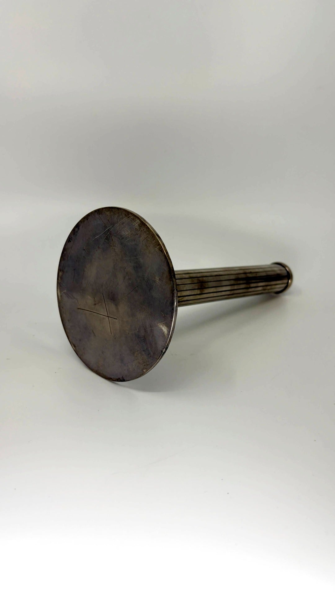 • Caractéristiques particulières : métal argenté, base ronde martelée, corps à nervures cylindriques