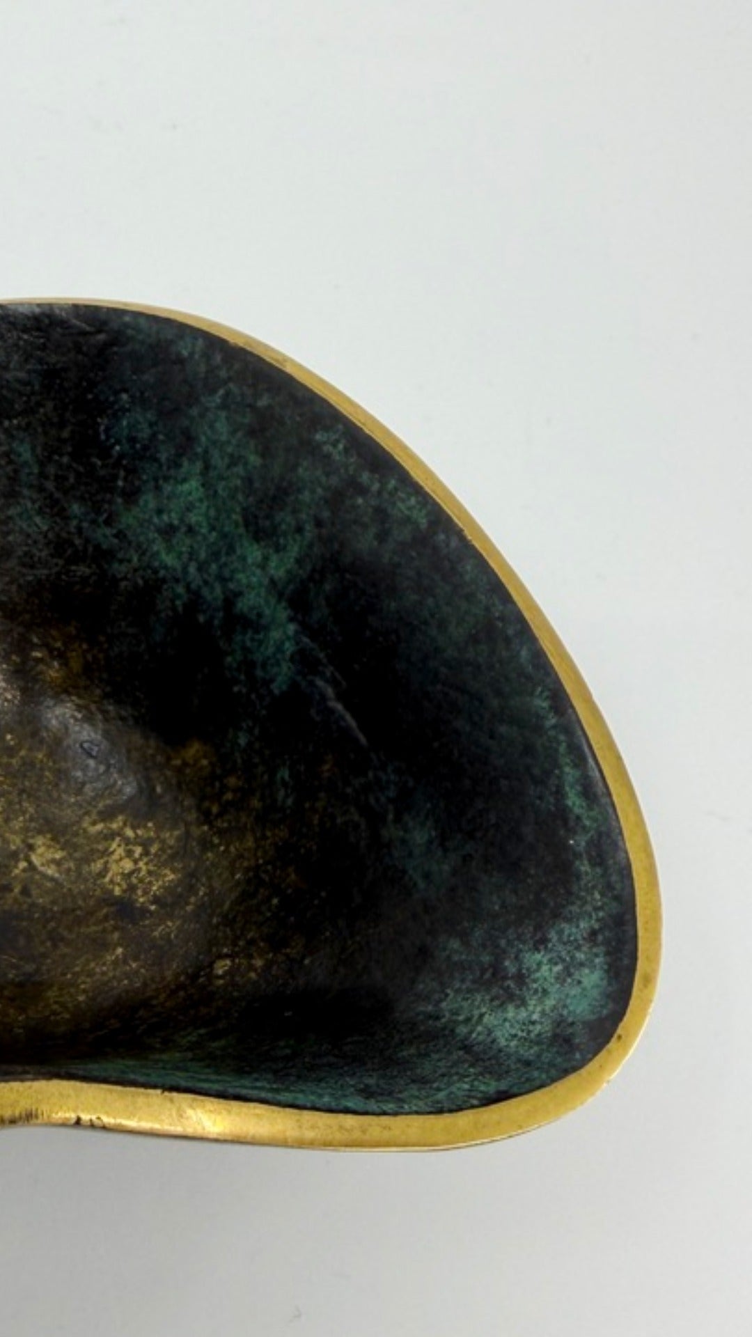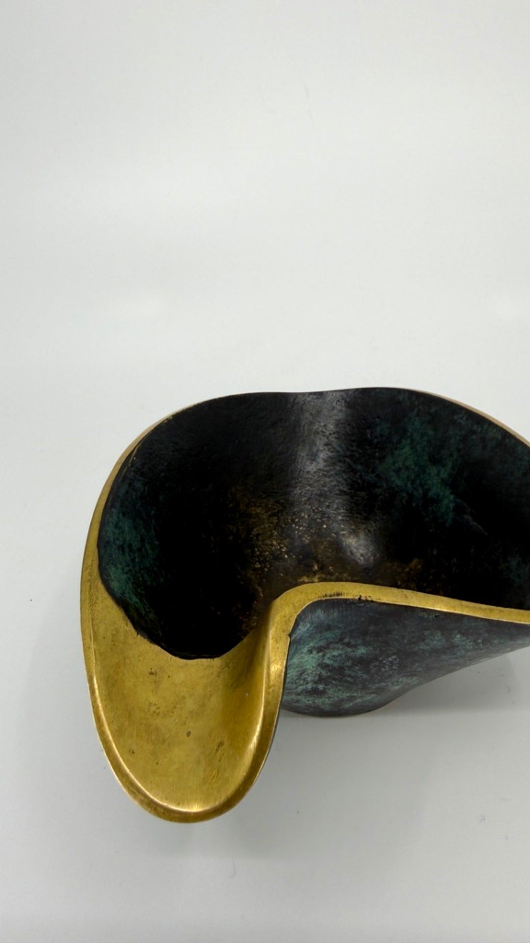 Dieses elegante Designstück aus der Werkstätte Carl Auböck besticht durch seine freie, skulpturale Formensprache. Die patinierte Bronze verleiht dem österreichischen Meisterwerk aus den 1950er Jahren eine zeitlose Ausstrahlung. Ursprünglich als Aschenbecher konzipiert, fungiert die Ablageschale heute als vielseitiges Accessoire für Schreibtisch oder Sideboard. Mit den Maßen 19 × 9,5 × 5 cm präsentiert sich das Stück in authentischem Gebrauchszustand – ein charaktervolles Zeugnis seiner Geschichte.