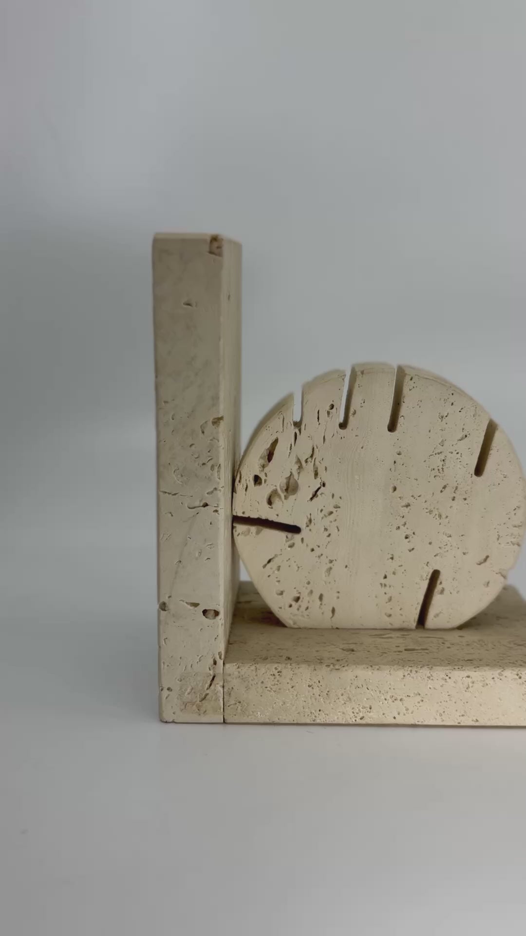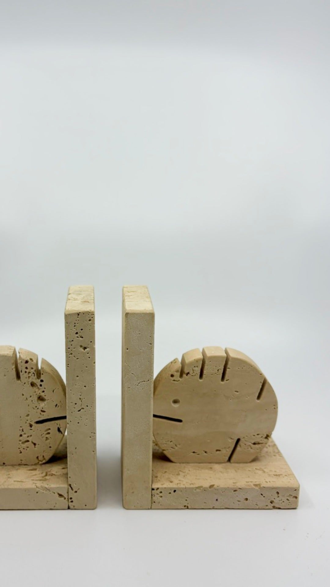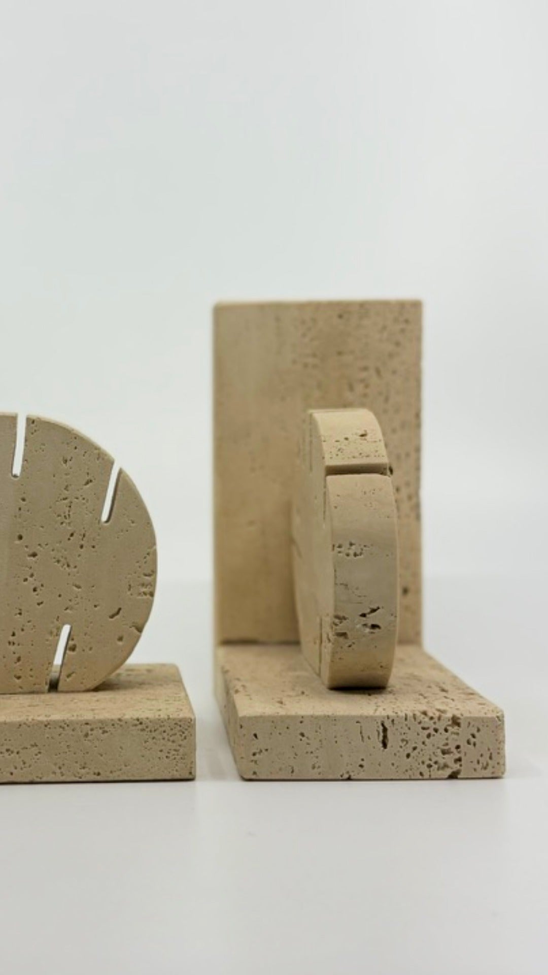 Elegantes Paar Bücherstützen aus beigefarbenem Travertin, entworfen von Fratelli Mavelli um 1970. Diese italienischen Designklassiker verkörpern die Ästhetik des Brutalismus mit ihrer reduzierten, geometrischen Form. Das natürliche Steinmaterial verleiht jedem Regal Wärme und zeitlose Eleganz. Mit den Maßen 15 × 14 × 8 cm bieten sie stabile Unterstützung für Ihre Buchsammlung. In sehr gutem Zustand – ein authentisches Stück italienischer Designgeschichte für anspruchsvolle Sammler.