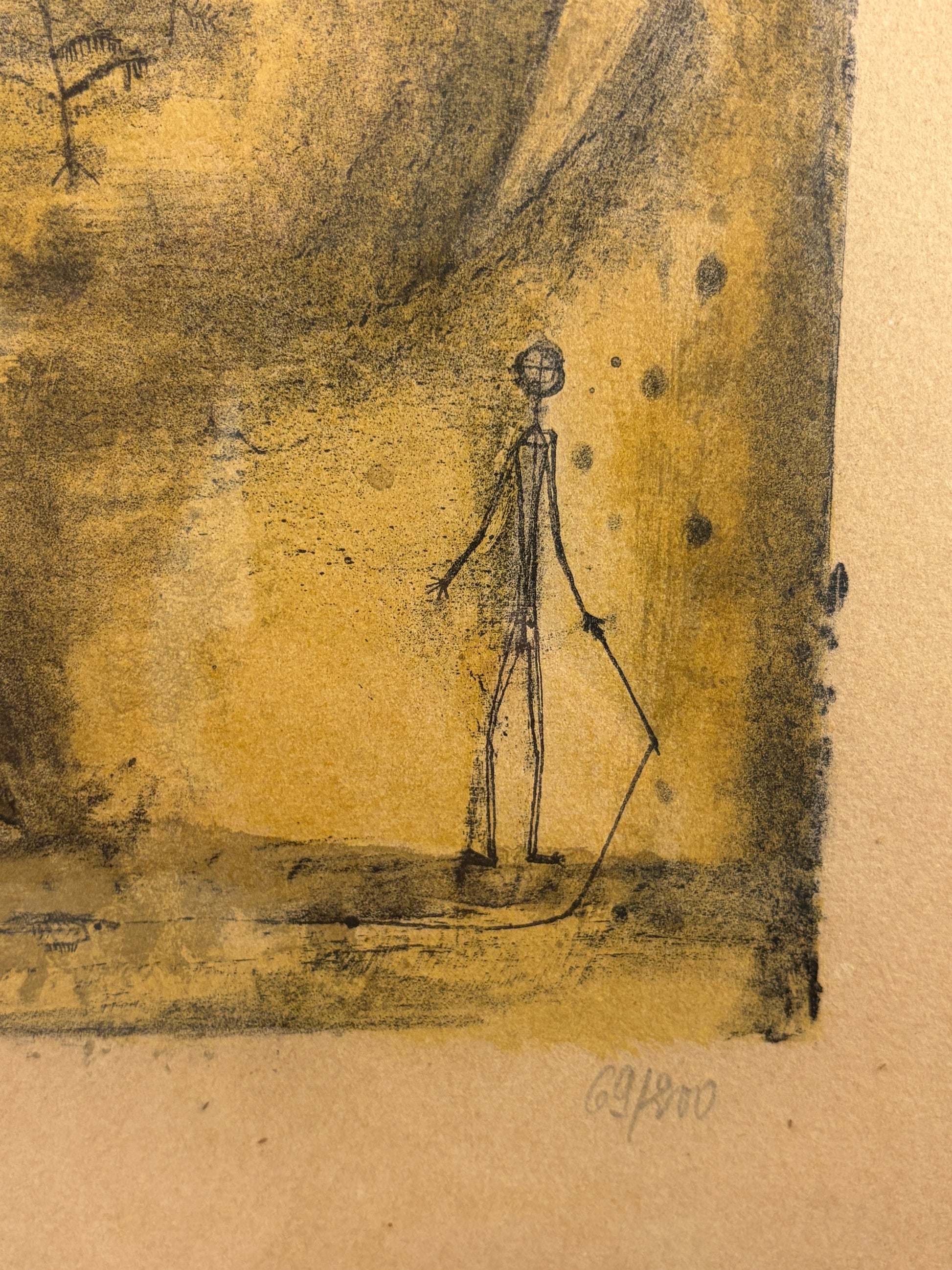 Die Farblithografie des renommierten Künstlers Zao Wou-Ki (1921-2013) besticht durch eine subtile Verschmelzung abstrakter und figurativer Elemente, die eine von Sonnenlicht durchflutete, heitere Szenerie evoziert. Dominiert von warmem Gelbton, zeigt die Komposition stilisierte Bergformen, die sich elegant zum Himmel erheben, während die leuchtende Sonne das Gesamtbild vollendet. Das Kunstwerk präsentiert sich in ausgezeichnetem Zustand und wird von seinem originalen Rahmen vollendet.