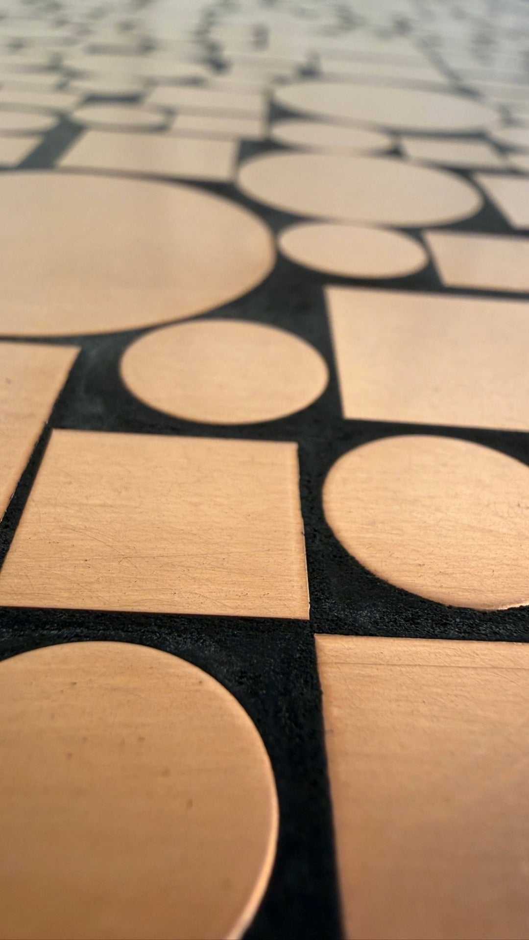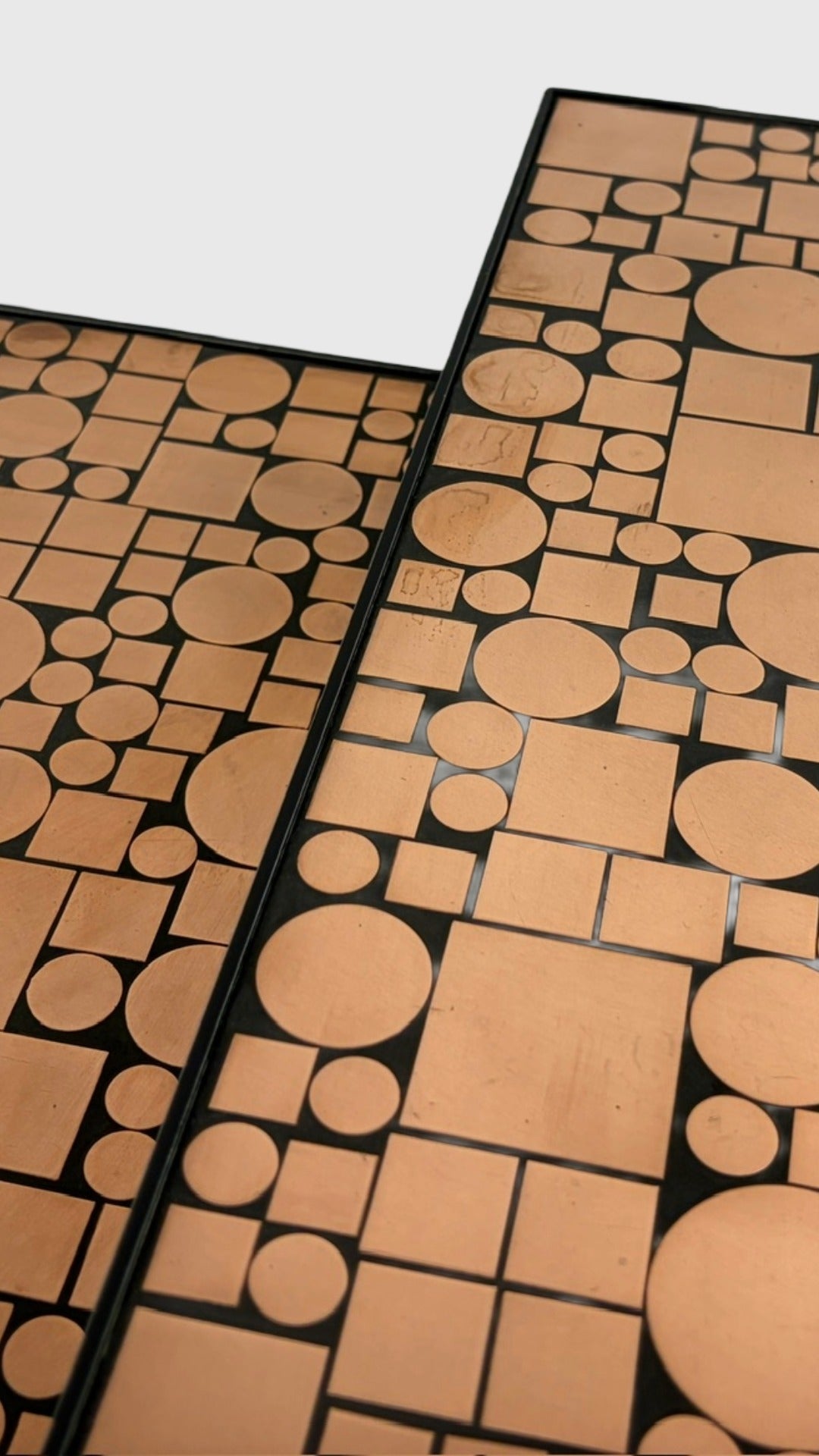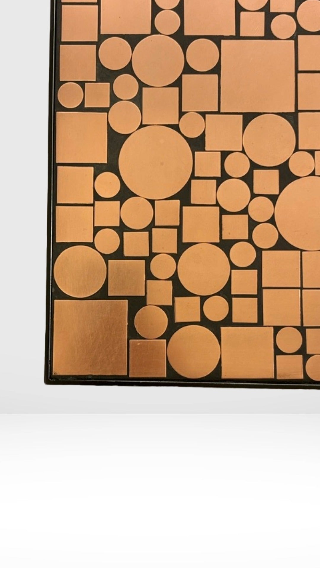 - Material: Mosaiktischplatte aus Kupfereisen, Tischplatte aus zufällig angeordneten Kupferkreisen und Quadraten auf schwarzem Stahlrahmen
