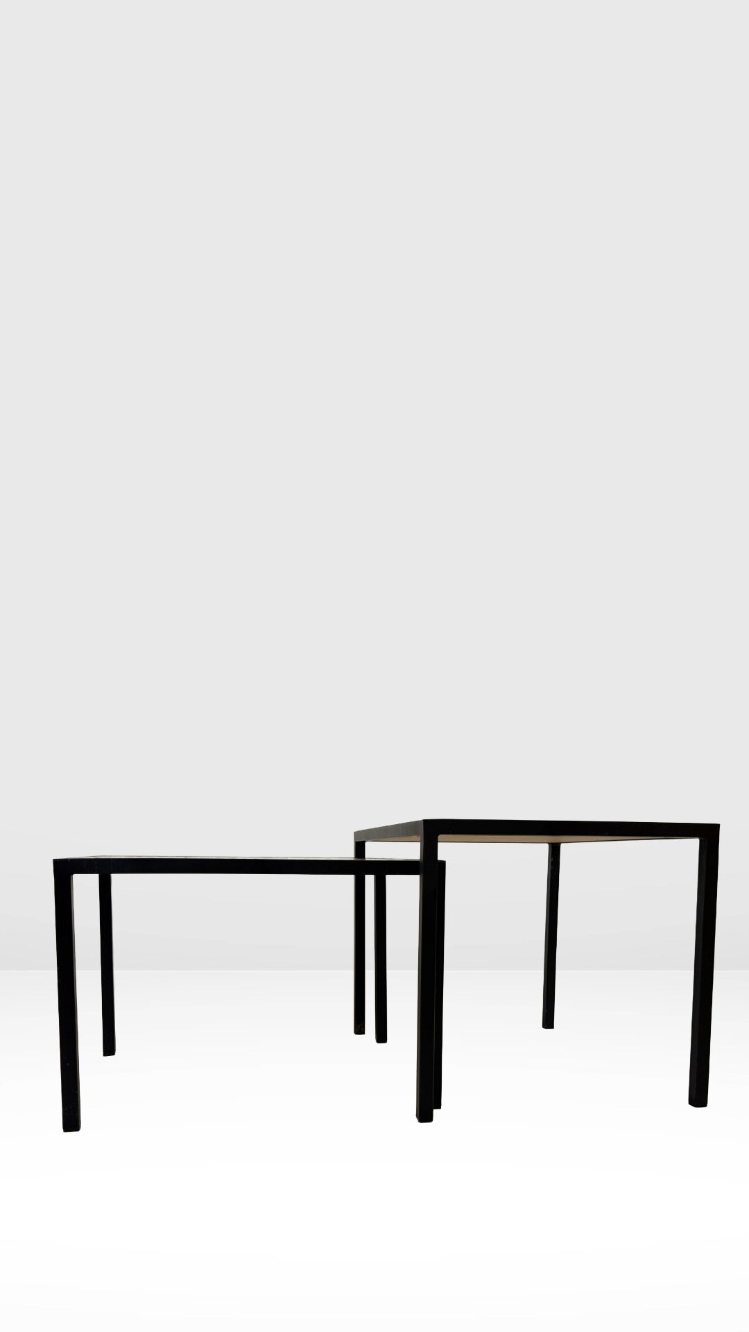 Seltenes Designerset aus zwei Tischen des renommierten Designers Herbert Hirche, um 1970 von Rosenthal in limitierter Auflage gefertigt. Die charakteristischen Mosaiktischplatten bestehen aus kunstvoll angeordneten Kupferkreisen und Quadraten auf schwarzem Stahlrahmen – ein meisterhaftes Beispiel für die geometrische Formensprache der Nachkriegsmoderne. Beide Tische befinden sich in gutem Zustand und verkörpern die zeitlose Eleganz deutscher Designklassiker. Ein Sammlerstück für Liebhaber authentischer Möbelkunst.