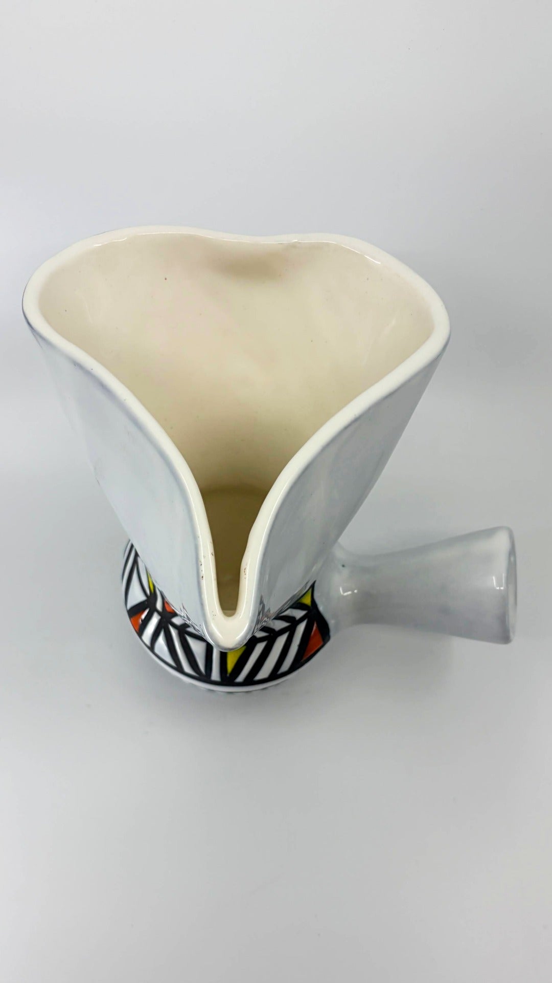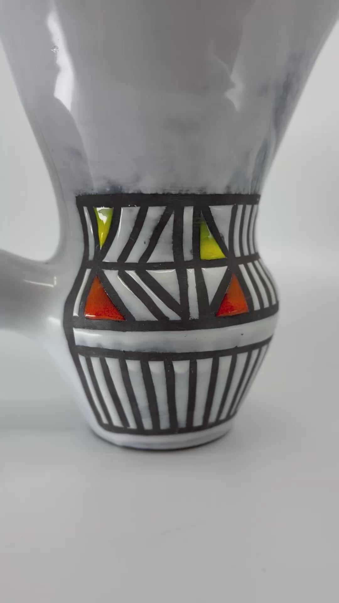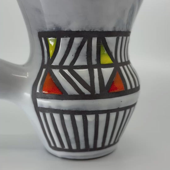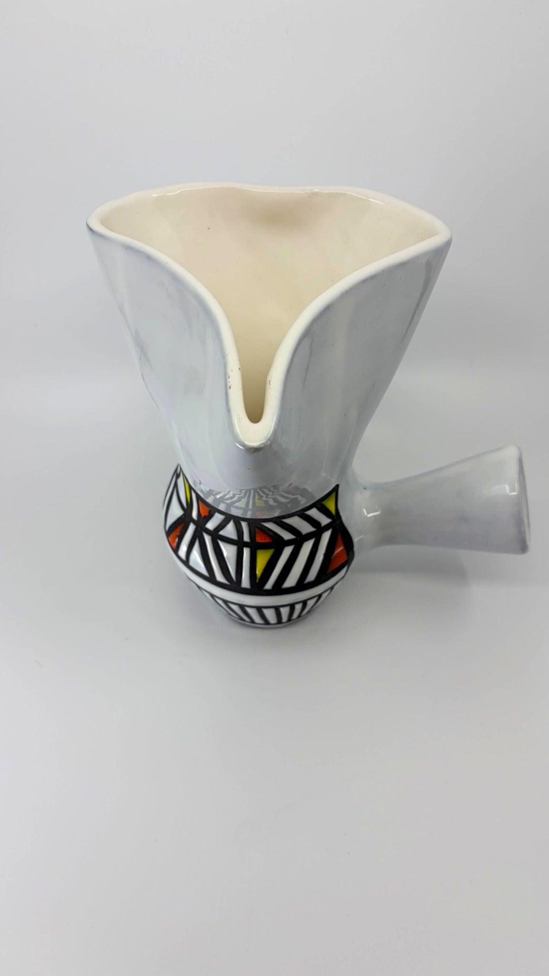 Dieses elegante Keramikgefäß stammt aus der Hand des renommierten französischen Designers Roger Capron und trägt seine charakteristische Signatur. Entstanden in den 1960er-1970er Jahren, besticht die Schokoladenkanne durch ihre harmonischen Proportionen (ca. 23 x 23 x 19 cm) und die raffinierte Kombination aus cremefarbener Glasur und farbigem Dekor. Das Stück aus Vallauris verkörpert die künstlerische Qualität dieser Epoche und befindet sich in ausgezeichnetem Zustand. Ein zeitloses Beispiel französischer Keramikkunst für Sammler und Liebhaber hochwertiger Designobjekte.