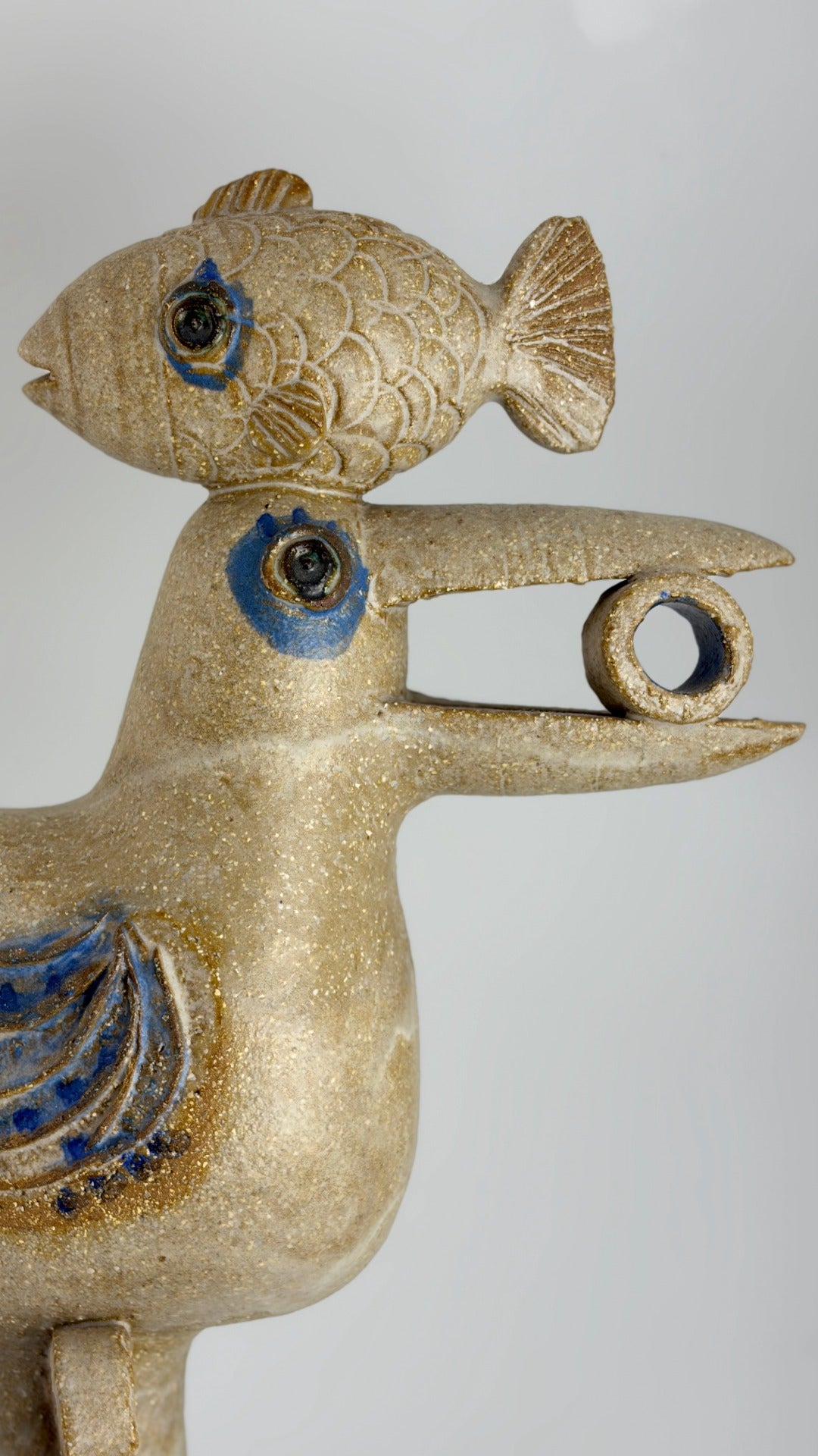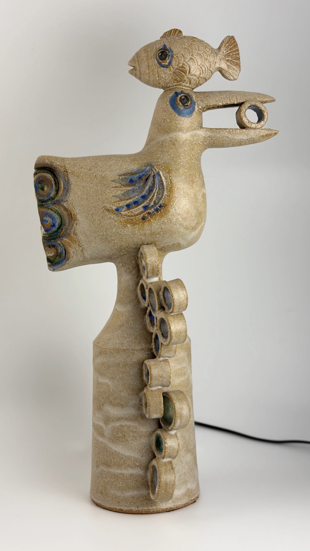 Diese seltene Keramiklampe von Pierre Koppe aus dem Jahr 1979 verbindet Funktionalität mit künstlerischer Ausdruckskraft. Das Originalstück besticht durch seine zoomorphe Form und die charakteristische strukturierte Glasur in Grau und Kobaltblau. Handgefertigt in Frankreich, zeigt die Lampe die meisterhafte Keramikarbeit des Designers. Mit den Maßen von etwa 52 x 29 x 17 cm prägt sie jeden Raum als skulpturales Kunstobjekt. Der ausgezeichnete Originalzustand macht dieses Sammlerstück zu einer wertvollen Ergänzung für Liebhaber moderner Designkunst.